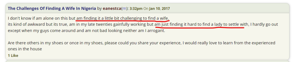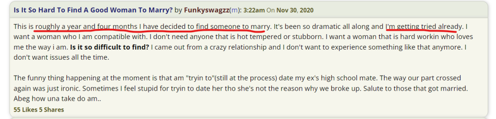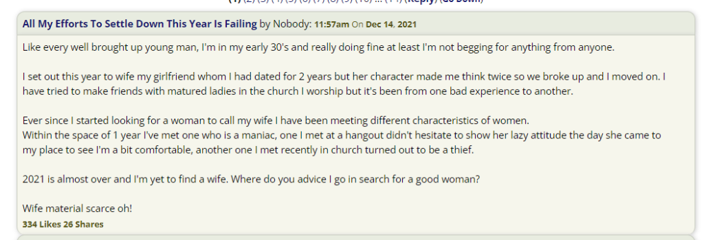 If you can’t read the texts in the screenshots above, they are real statements made on Nairaland (a popular Nigerian website) by men who are desperately searching for good women to marry.