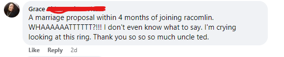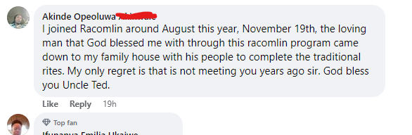 Meaning that out of every 10 women who made it into Racomlin group, 4 found a suitable man and eventually got married within months.