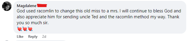 The Racomlin method also helped Opeoluwa, a 33 year old jobless accounting graduate who considered herself “too fat” and “unattractive”, find a civil engineer suitor.